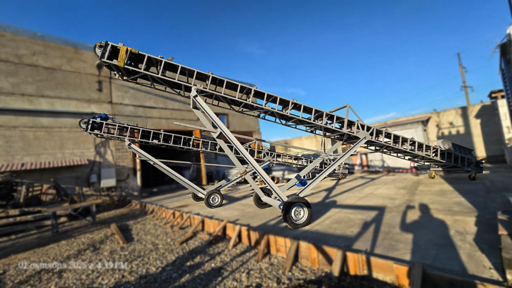 Ленточный желобчатый наклонный транспортер с регулируемой высотой для транспортирования сыпучих, инертных и кусковых материалов с подъемом по трассе